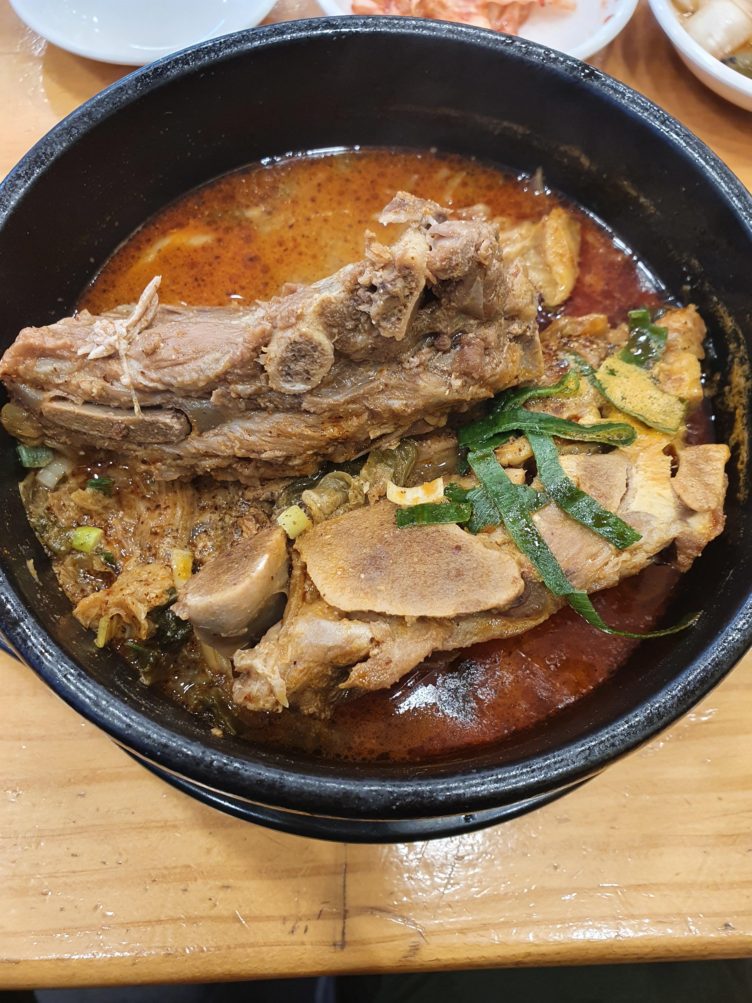 시킨 지 5분 정도 지나서 뼈해장국이 나왔습니다. 팔팔 끓는 뼈해장국 위에 채 썰은 파와 들깨가루가 뿌려져 나왔습니다. 국물을 먹어보니 누린내도 나지 않고 진하게 맛있었습니다. 양도 많지도 않고 적지도 않은 딱 적당한 양이었습니다. 고기는 뼈 큰 것 2개가 들어있었는데 개인적으로 적당했습니다. 또 간이 잘 배서 따로 소스에 찍어먹지 않아도 맛있었습니다. 요즘 같이 날씨가 갑자기 추워지는 날에 어울리는 맛있는 메뉴였습니다.